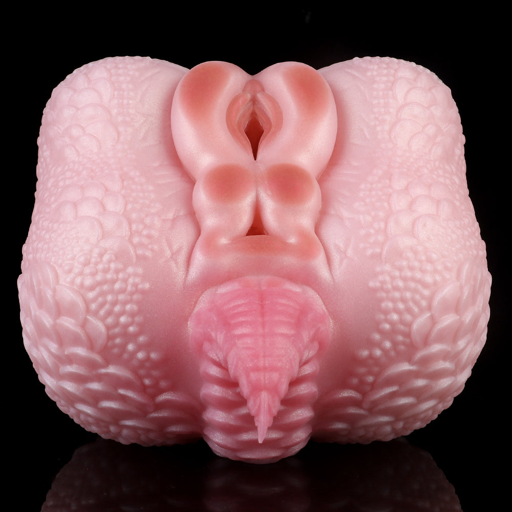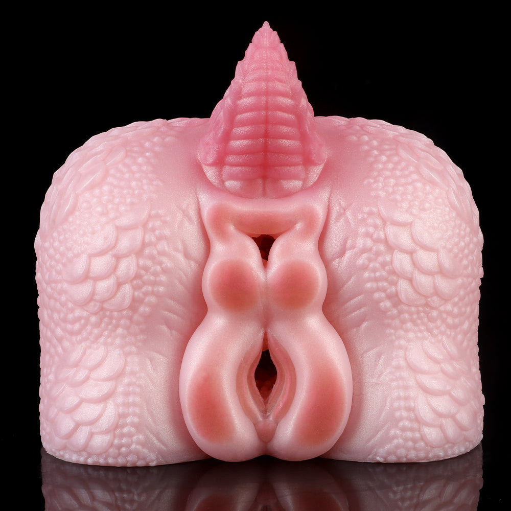 The lower half of a molten crimson dragoness—sculpted in seamless medical-grade silicone—dedicated solely to primal tug-of-war between twin infernal gateways. Twin tongue-in-groove canals (front and rear) each coil with furnace-hot ribbing that clench and release like a dragon’s heart beating around you. The scaled outer lips flare ever so slightly, giving perfect grip points to hold her hind-paws aloft while you give her both dragon-fire entrances one after the other, or swap between them mid-thrust. Squeeze the 49 cm circumference haunch to feel the pressure mount; finish inside, cool her under a gentle stream, and seal the fire away till next time.